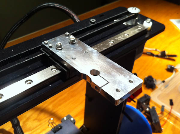 The extruder mounts with two M3 x 18 screw into the rear holes right to the X carriage, and two M4 x 12’s (that came with the extruder) to the holes a tapped in the new mount. (M4 x 14’s would be a better fit here.)